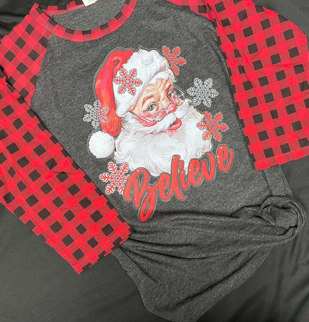SANTA ON WHITE BUFFALO PLAID PRINT SLEEVE RAGLAN SHIRT