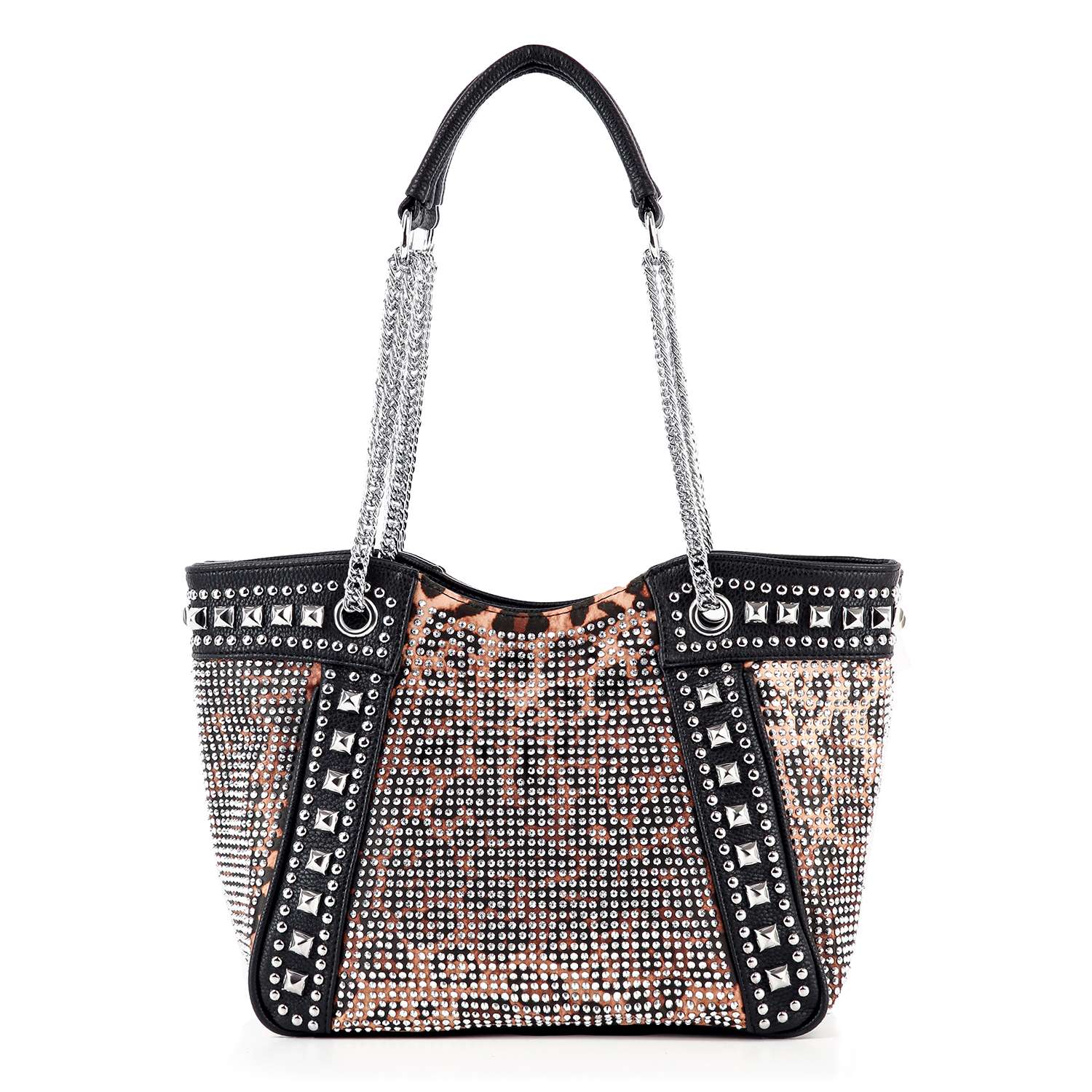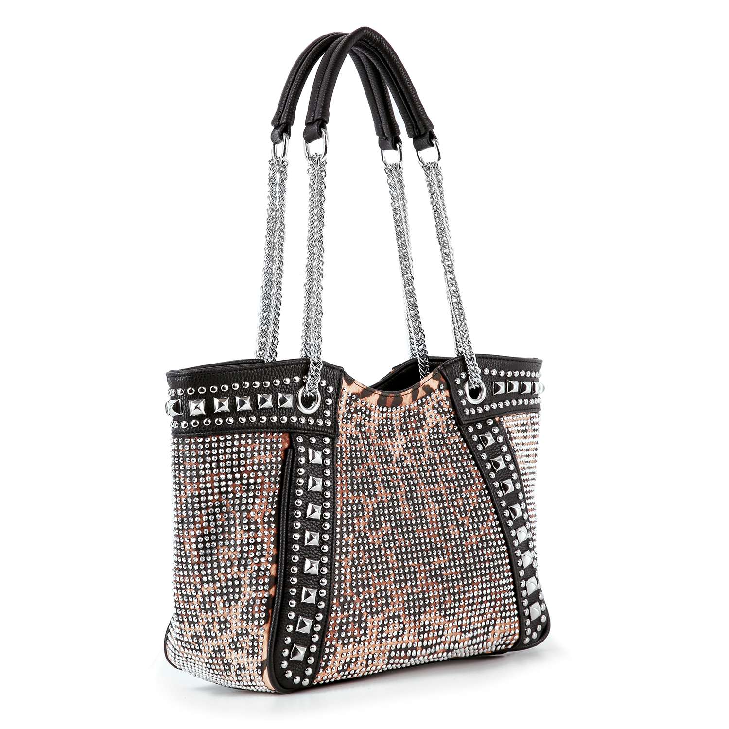 Mesmerizing rhinestones with studded trim dazzle this tote that is finished with chain handles. This is what you wear when you want to be noticed!