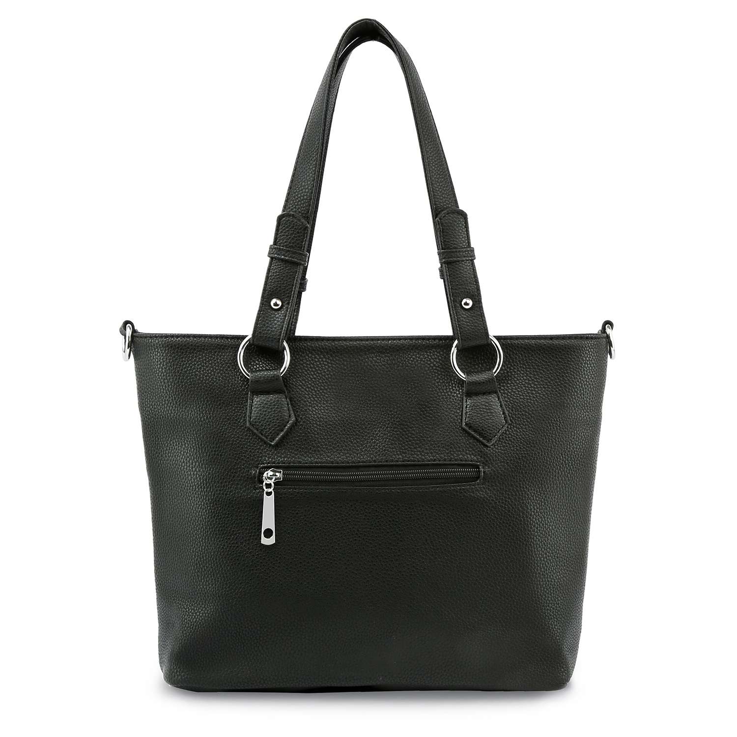 * 1 back zip pocket. * 10L double handles; 22L detachable strap. * Faux leather with lined interior. * 2 interior slip pockets & 1 zip pocket. * Top zip closure. * Silver hardware. * Tablet compatible (std. size 8-10in). Approximate Size: 15L X 10.5H x 4.5W