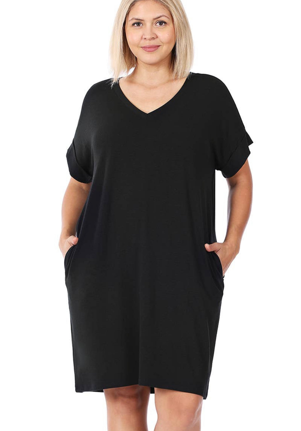 SLEEVELESS V NECK WITH BAR NECKLINE DETAIL SOLID DRESS WITH SIDE POCKET DETAIL