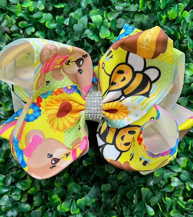 HONEY BEE BEAR AND SUNFLOWER PRINT BOWS WITH RHINESTONE CENTER (roughly 8”)