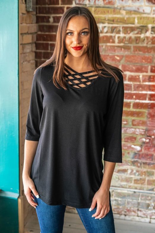 SHORT SLEEVE V NECK SOLID TOP WITH SIDE SLIT DETAIL