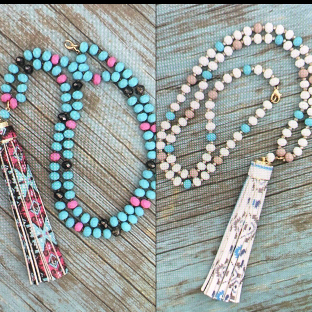 BEADED FABRIC TASSEL NECKLACES IN 2 COLOR CHOICES