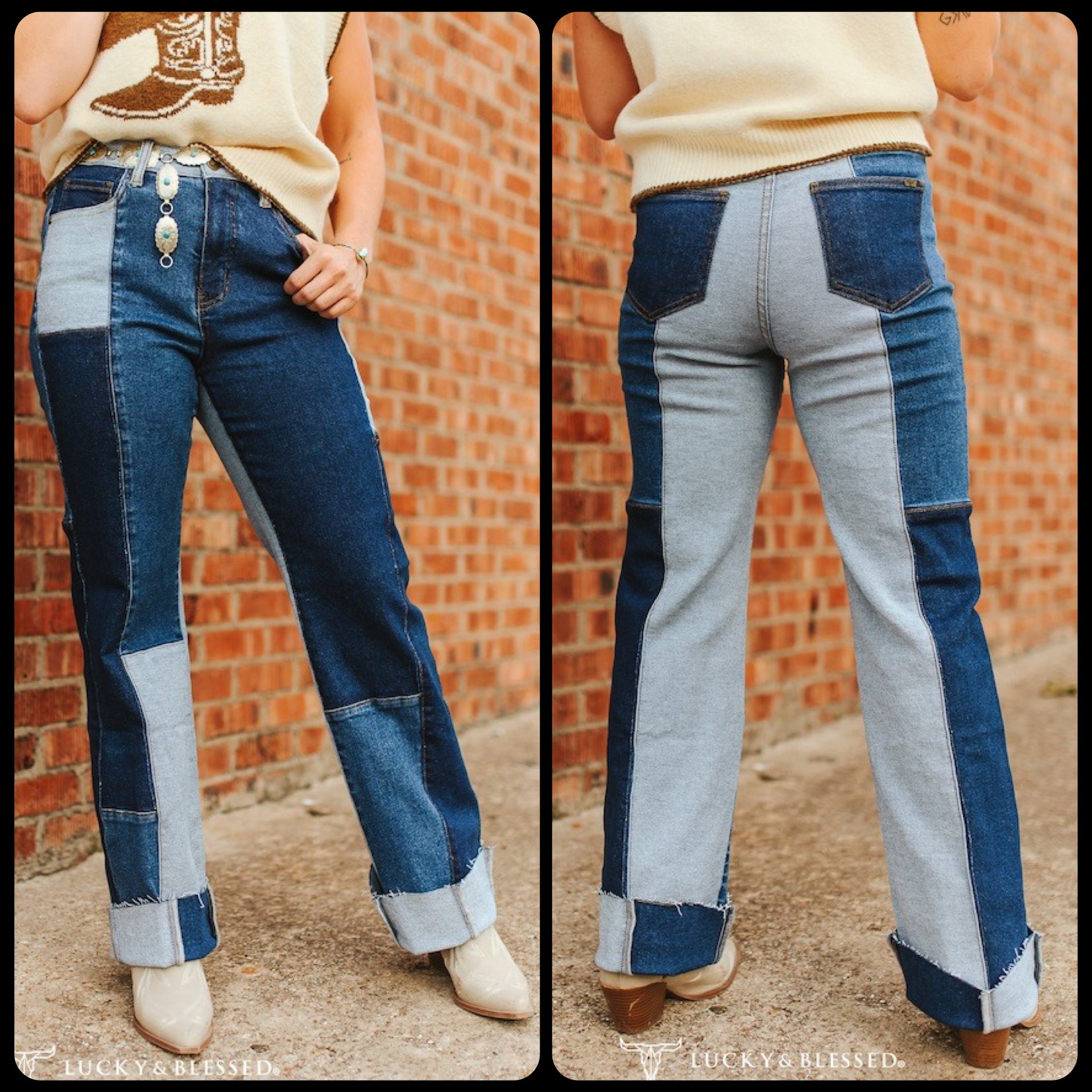 Make a bold statement in these two-tone patchwork denim jeans featuring a contrast block panel design with cuffed hems. These high-waisted jeans combine the classic appeal of mid and light wash denim with a modern Western twist. The wide leg silhouette elongates the legs while the raw-edge cuffs add a touch of rugged character. Ideal for pairing with your favorite boots and graphic knits, these jeans deliver a head-turning Western look for the contemporary cowgirl.